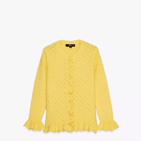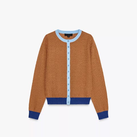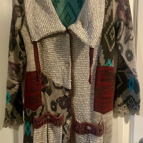 Zara cardigan i størrelse M, laget av akryl. Cardiganen har et flerfarget mønster med ulike geometriske detaljer. Den har belte for justering og oppbrettede ermer med mønster. Egnet som ytterplagg eller lag-på-lag plagg i kaldere vær. Hemper for beltet på høyre side trengs å festes, ellers er den som ny