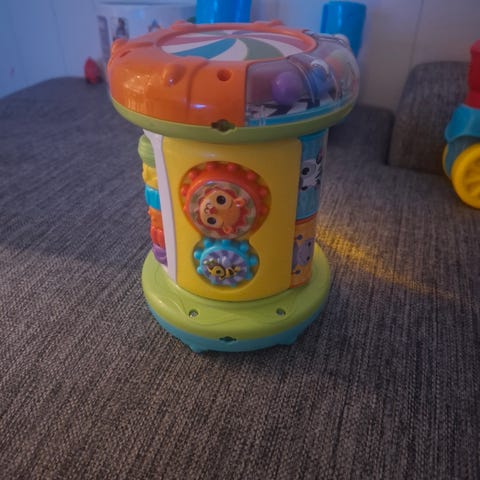 Fisher-Price aktivitetsleke for barn med ulike interaktive elementer som roterende alfabetplate, telefonhåndsett, musikalske knapper og fargerike detaljer. Designet for å stimulere barnas læring og motoriske ferdigheter.