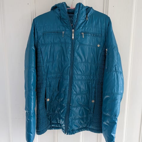Personen på bilde er ca 173 cm. Noe variasjon på bildene, men riktig farge er gul som vist på bilder av personen. Str M, men se mål på bildene. Jakka er tilnærmet ubrukt. Det er ikke dun.
