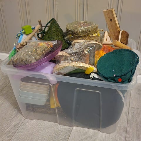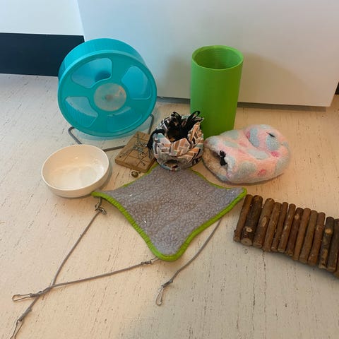 Ulike hus, hjul, broer og oppholdssteder for hamster eller andre gnagere