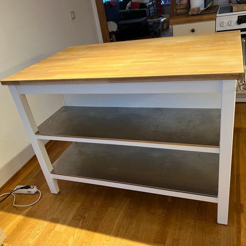 Veldig pen kjøkkenøy i tre. Farge hvit med sort plate, hvor man kan se tremønsteret i den sorte matte fargen.