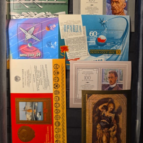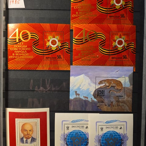 Innstikkbok 64 sider med meget stor dublett samling postfrisk fra Sovjetunionen 1960-1977. Med forbehold om at det kan ha sneket seg med noen merker med hengselrest eller stempel. Se bilder som viser alle merkene. Hentes på Jessheim eller sendes mot forhåndsbetaling pluss porto. Porto kr 80,- som sporbar postpakke.