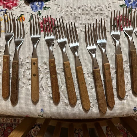 Pent brukt biffbestikk til 6 personer selges samlet.