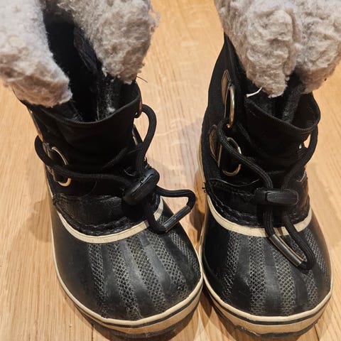 pent brukte vinterstøvler fra Sorel. Innerstøvel i filt. Nederdel i gummi. Lukkes med snøring øverst på skaftet og en regulerbar, elastisk borrelåsrem. Yttersåle i gummi.