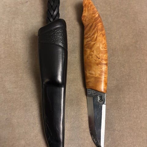 Kniven har skaft av briar, holk av ibenholt og tiurpin. Smidd knivblad av Steen Nilsen ca 8cm langt. Slire av rårandslær innsatt med lærfett.