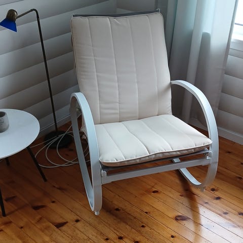 To hvite gyngestoler med sort understell