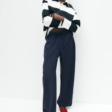 En bukse i luftig vevd viskosekvalitet med høy midje med trukket elastikk og smal snøring. Ledig passform med diskrete lommet i sidesømmene og vide, rette ben. Ny og ubrukt!