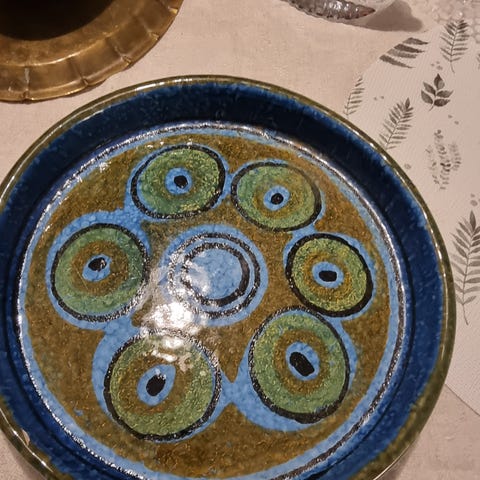 Bitossi fat ca. 5 cm. høyt og ca. 20 cm. i diameter. Fatet har et nag på kanten av bollen som vist på bildet over. Fargene på bildene over viser ikke helt riktig. Fatets farger fremstår skarpere en det er. Prisen settes til kr. 250,- grunnet nag.