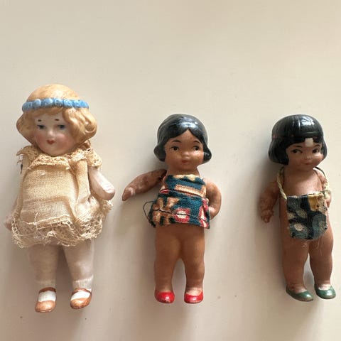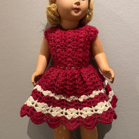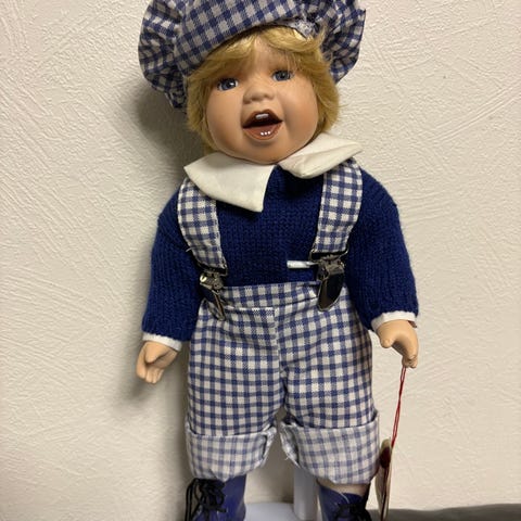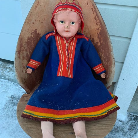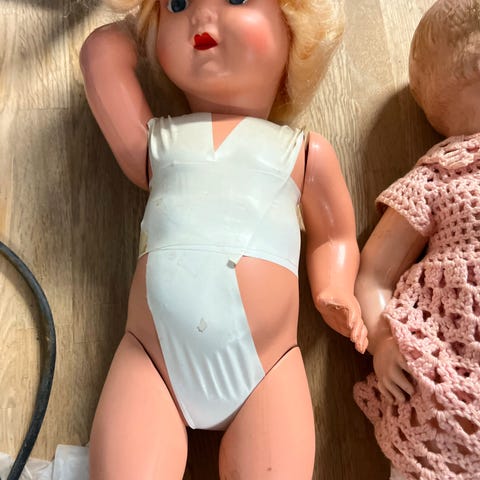 En veldig fin dukke fra slutten av 50 tallet. Merket: Ratti - Made in Italy. Dukken har bare sittet til pynt, og den har aldri vært lekt med. Høyde: 50 cm. Kroppen er noe mørkere i fargen i forhold til hodet, men slik har hun alltid vært.