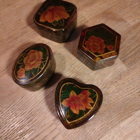 - Skrinet er laget av trebasert materiale med dekor i decoupage (trykt papir med lakkert overflate).