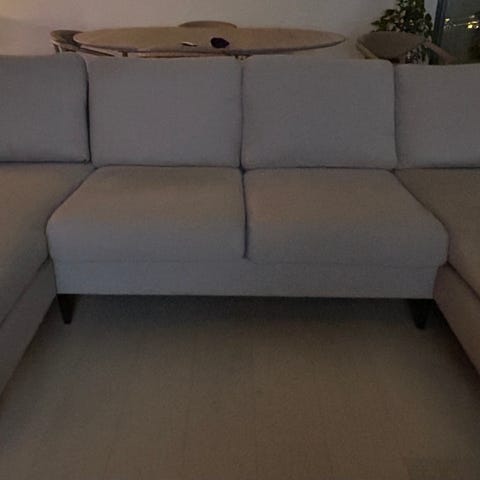 Pent brukt sofa, 3 store seter og praktisk oppbevaring under sjeselong. Se mål av sofaen på bildene.