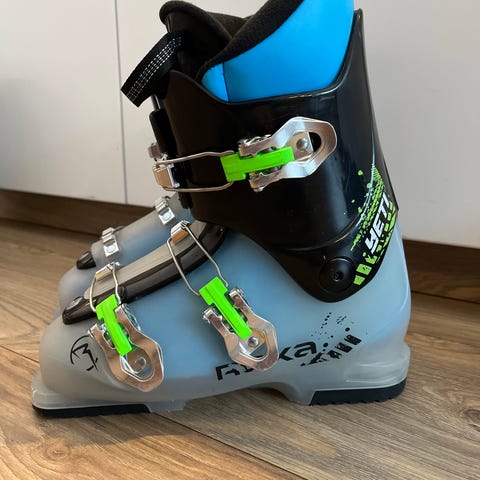 Nordica skistøvler i grønn farge med størrelse 24.1. Skistøvlene har flere spenner for justering og en polstret innerfôr for komfort.