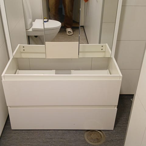 Baderomsinnredning i tre med skap under vask, speilskap med belysning og høyt skap. Inkluderer servant med armatur og avløp. Passer til oppbevaring og funksjon på bad.Innredning er uten skader,men er noen mørke striper i vask.Lys spottene ble byttet til nye led lys for en stund siden.