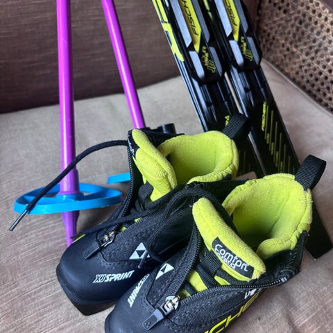 Lengde på skiene: 130 cm. Stavene er 110 cm.