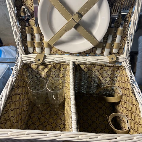 Uåpnet tursett med trekopp, kniv i slire, trebestikk og matboks med salt/pepperbøsse og skjærebrett.