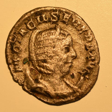 To antikke romerske mynter med portrett og ulike motiver på forsiden og baksiden. Mynter i slitt tilstand med synlige detaljer fra den romerske perioden. Kan være av interesse for samlere av historiske mynter.