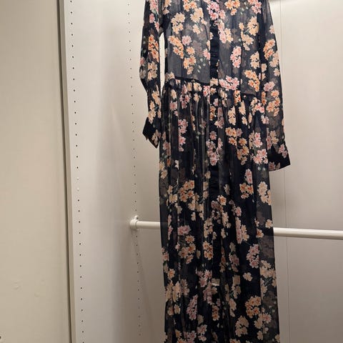 Bik Bok hverdagskjole i størrelse S, flerfarget med blomsterprint. Laget av polyester. Kjolen har lang arm og knyting i livet.