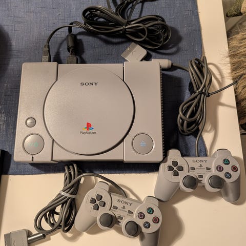 Sony PlayStation 2 spillkonsoll med to kontroller og kabler
