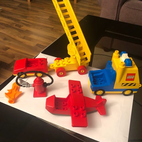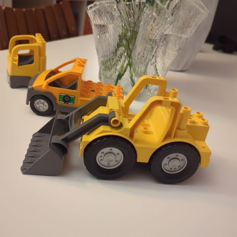 Duplo bil og campingvogn med figur. Campingvogn mangler takdør