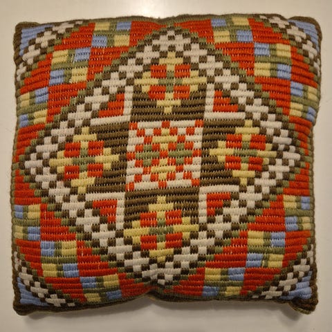 Klare, tidsrktige farger. Ekte, glade farger fra førti år tilbake. I fin stand. Brodert med ullgarn. Bakstykke er en glatt stoff men jeg vet ikke hvilket. Må håndvaskes.