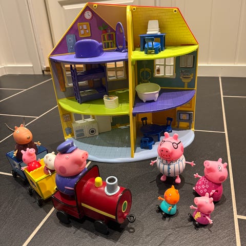 Peppa Gris lekesett som inkluderer flere figurer fra serien, bil, tog og en sykebil. Settet består av ulike karakterer i plastmateriale, egnet for barn som liker rollelek og samling av figurer.