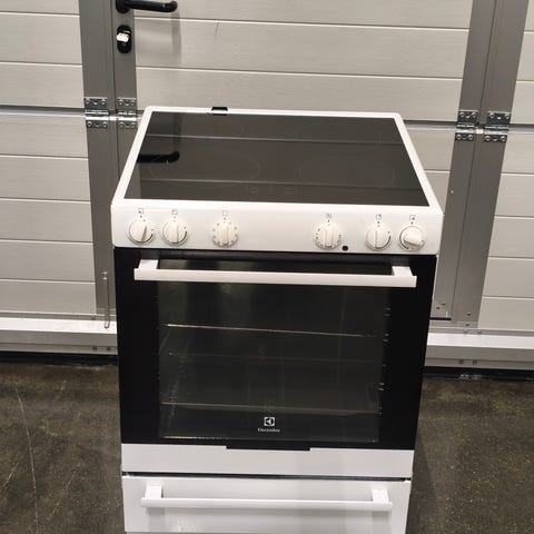 Gram induksjon komfyr med keramisk topp og integrert ovn. Komfyren har flere kokeplater med induksjonsteknologi, som gir rask og effektiv oppvarming. Ovnen har flere rilleposisjoner for stekebrett og rist, og en dør med glasspanel for enkel overvåkning av matlagingen. Komfyren er hvit og har et kontrollpanel med knapper og display for innstilling av temperatur og funksjoner.