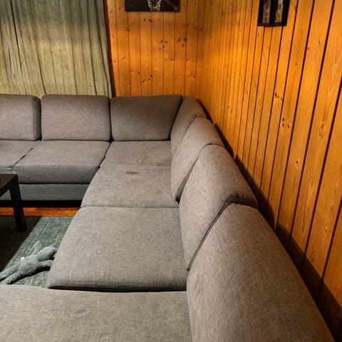 Grå sofa til salgs, god stand, fortsatt mye brukt, trenger rengjøring, revet på ett sted, men kan sys sammen.