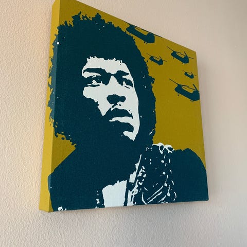 Maleri som viser et ansikt i stort format med varme farger som oransje, blått og brunt. Maleriet har en moderne stil med tydelige penselstrøk og geometriske former. Egnet til dekorasjon i stue eller andre oppholdsrom.