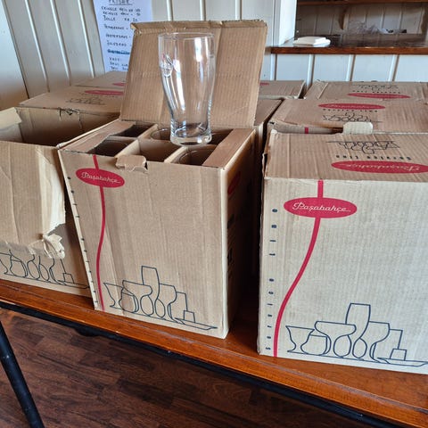 Banquet glass med kapasitet på 255 cl, totalt 83stk. Glassene er laget for bruk i kjøkken og servering, egnet for ulike typer drikke.