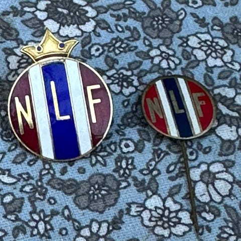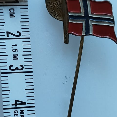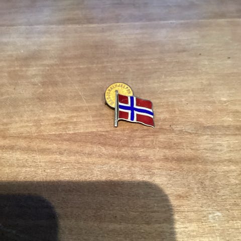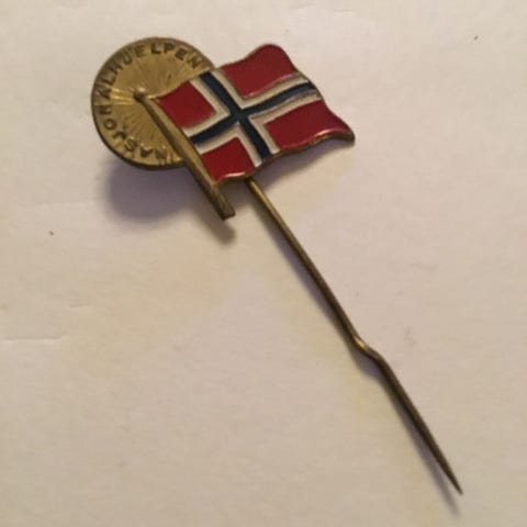 David Andersen Nasjonalhjelpen 1940 pins med norsk flagg motiv. Laget i metall med emaljert farge.