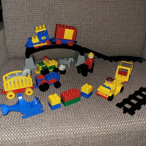 Mange forskjellige Duplo-klosser, inkludert fly, tog og morsomme dyr.