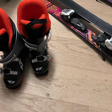 Nordica J4 alpinstøvler i størrelse 26-26.5 cm. Støvlene har svart og grå farge med røde detaljer. De er utstyrt med fire metallspenner for justering og en borrelåsstropp øverst. Yttersålen er 305 mm lang. Støvlene har vært brukt i en sesong av en gutt med 41 i skostørrelse.