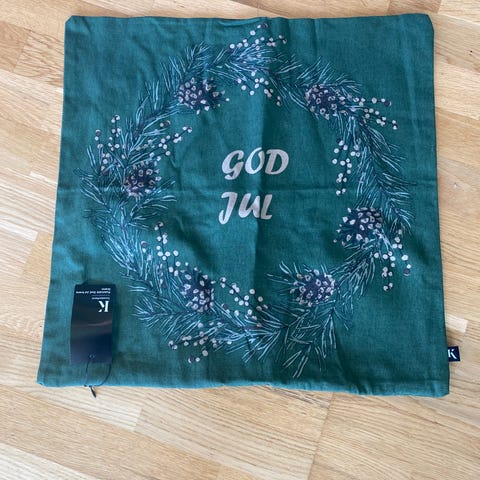2 helt nye putetrekk kjøpt på Feel. Klassisk design med grønn krans og kongler på naturfarget bakgrunn. Myk blanding 85% polyester og 15% lin. 60kr pr stk eller 110kr for begge