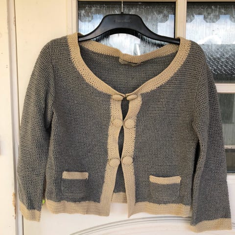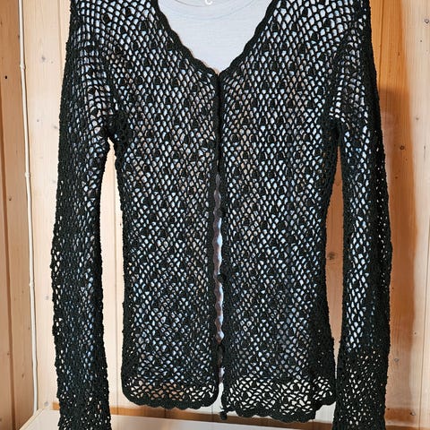Kjempefin og feminin heklet bomullsjakke med tilhørende knytebelte og flotte detaljer ( se bilder)