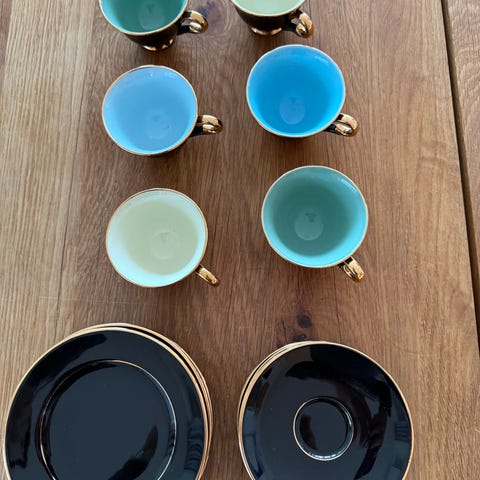 Selger et originalt kaffekopp-sett fra Figgjo Flint, produsert i Norge på 1950–60-tallet. Typisk norsk mid-century design med delikate pastellfarger og gullfarget lusterglasur på innsiden av koppene.
