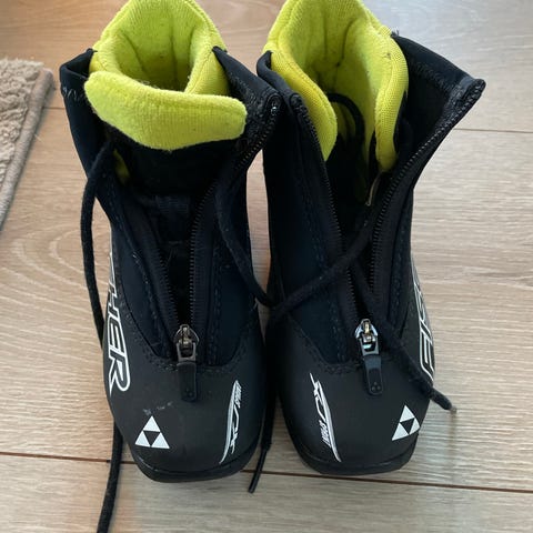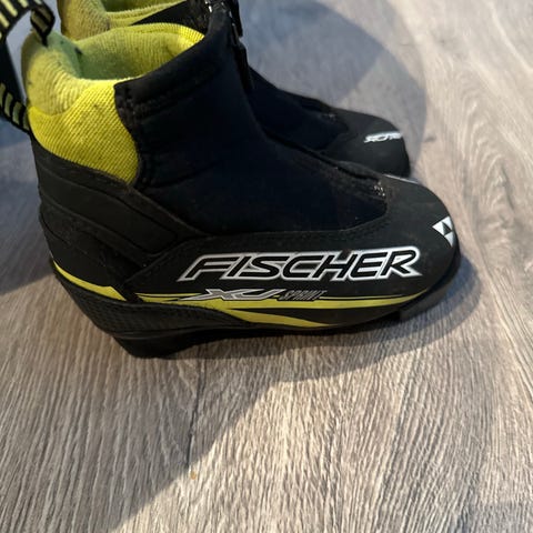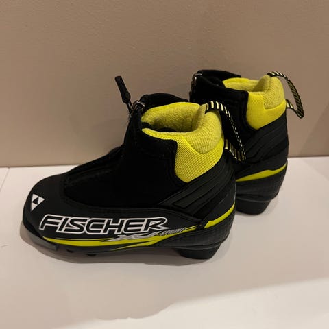 Fischer NXT langrennski sko i størrelse EU 25. Skoene har svart og gul farge, med syntetisk materiale i overdel, såle og fôr.