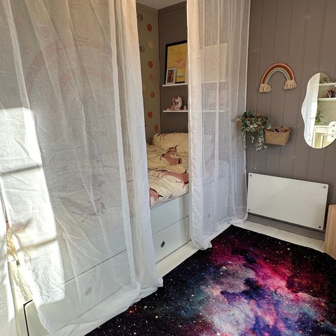 Sengen har slitasjemerker som vist på bilder. Hjul på skyvesenga er slitt og gummi har delvis falt av, men kan fortsatt fint trilles inn og ut. På den ene skuffa falt den ene skinna av, men kan fikses. Et par planker i senga er knekt.