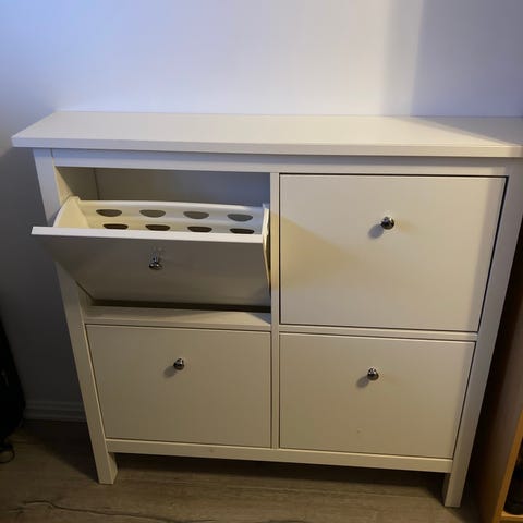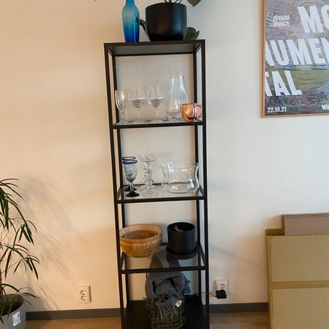 Selger Vittsjø hvit glasshylle fra Ikea. Brukt som «penhylle» i stue til servise og glass.