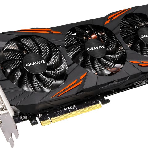 Gigabyte GeForce RTX skjermkort med trefans kjølesystem. Skjermkortet har flere videoutganger inkludert HDMI og DisplayPort,