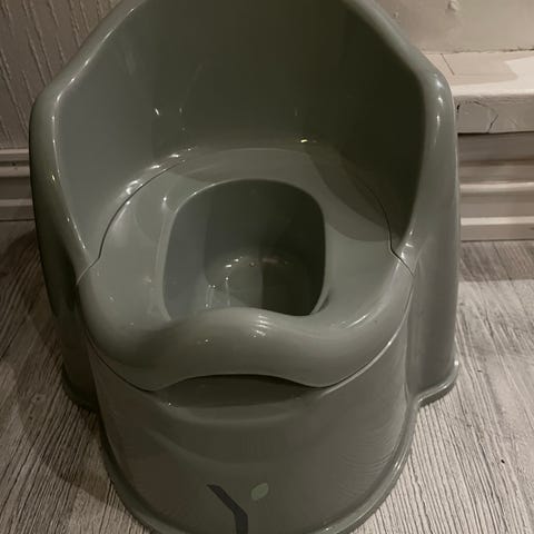 Yngri barnepotte i blå farge. Designet for barn, laget av plastmateriale. Egnet for bruk som toaletttrening.