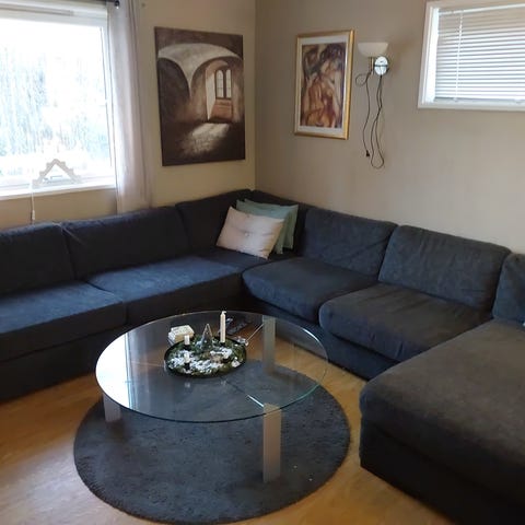 Vår hjørnesofa med pall er til salgs. Sofaen er mørk grå, 12 år gammel og er pent brukt. Stoffet er av god kvalitet og vi har renset sofaen flere ganger. Putene kan tas av og vaskes separat (gjelder både sitteputer og ryggputer). Total lengde er 315 cm. Total dybde er 80 cm og dybde for å sitte, er 55 cm. Sjeselongen er ca 200 cm lang. Sittehøyde er ca 40 cm.