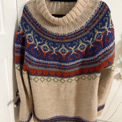 Håndstrikket Nepal-jakke med hekling og fleecefôr. I ull. Veldig varm og myk på innsiden Ny med lapp