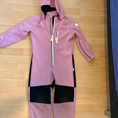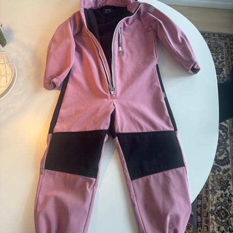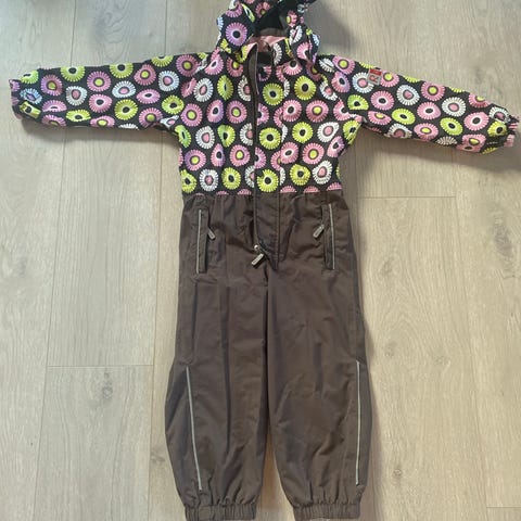 Reima barneheldress i størrelse 110 for jenter, laget av polyamid. Dressen er rød og designet for å gi komfort og beskyttelse ved utendørs bruk. En fotstropp har røket og må byttes.