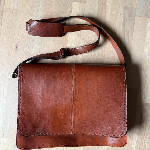 Vesken er i ekte lær og har rikelig med lommer til både pc, ipad, skrivebok og mer. Justerbar skulderreim og dobbel knappeforankring på lokket gjør denne svært anvendelig til daglig bruk. «Skrapemerkene» er naturlige og er et ønskelig preg på denne typen lærvesker som gir den et vintage uttrykk.