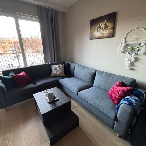 Pent brukt sofa, hatt i 4 år men brukt i ca 2 år da den har ligget i tørr og varm lager. Litt slitemerke på venstre lenearm (høyre på bildet).