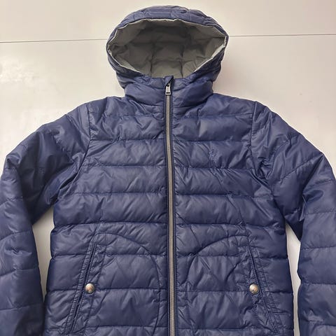 Ralph Lauren dunjakke i størrelse 140 for barn, unisex. Jakken har gul farge på den ene siden og marineblå på den andre siden, kan vendes og brukes på begge sider. Jakken er laget av dunmateriale, det er en tynndunjakke.