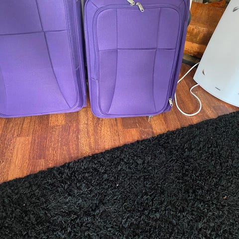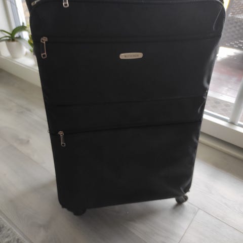 En kabinkoffert og en større koffert. Koffertene er brukt, men fungerer som de skal. Som vist på bildet, er det et hull i skillenettet i kabinkofferten.