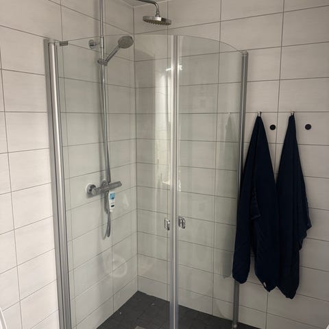 Fine 80×80 dører og blandebatteri og dusj.