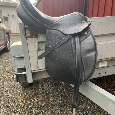 Svart Griffin syntetsal. En eldre sal, men ingen skader. Denne kan nok fint brukes på en hesterygg til lett bruk. Står ikke str på den, men tipper 17" i sete og ca vid bom. Vi har brukt denne også på "bukkhest". Kan selges med ekstra utstyr for 100 ekstra. Ønsker 600 kr for salen.