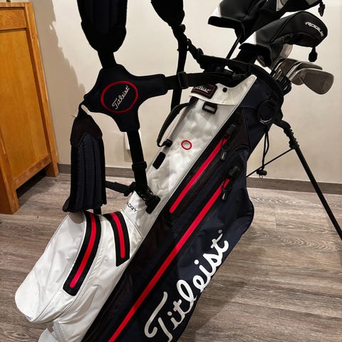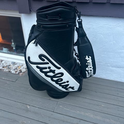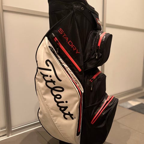 Titleist StaDry golfbag i svart farge. Golfbaggen er designet for å være vannavstøtende med flere lommer for oppbevaring. Passer for golfspillere som trenger en slitesterk og praktisk bag til utstyr.